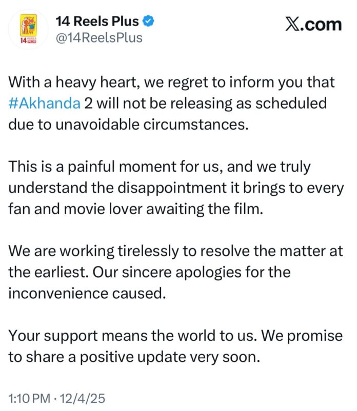 With a heavy heart, we regret to inform you that #Akhanda 2 will not be releasing as scheduled due to unavoidable circumstances.
