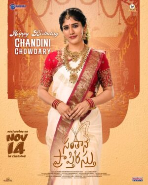Young and talented actress Chandini Chowdary, known for her memorable performances in hit films like Colour Photo and Gaami, is all set to charm audiences once again in her upcoming movie Santhana Prapthirasthu. The film, described as a youthful family entertainer, features Chandini in the role of Kalyani Oruganti.