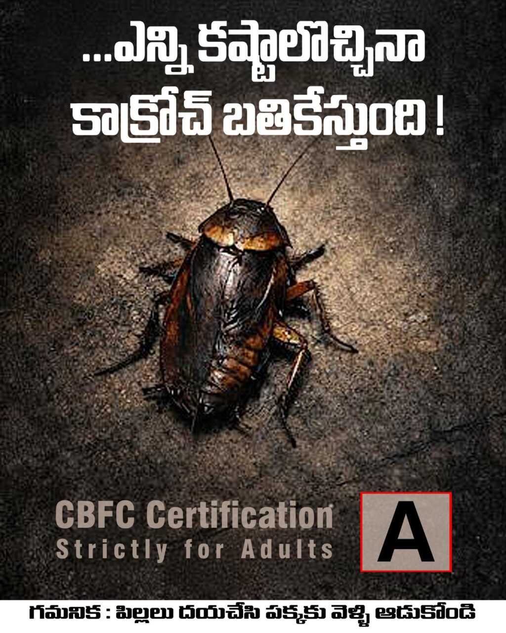 Directed by P. Suneel Kumar Reddy and produced by B. Bapiraju under the banner Sri Lakshmi Pictures, Cockroach has successfully completed its censor formalities. The Central Board of Film Certification has awarded the film an “A” (Adults Only) certificate. The director and producers have respectfully requested, through the press, that sensitive viewers and children refrain from watching the film.