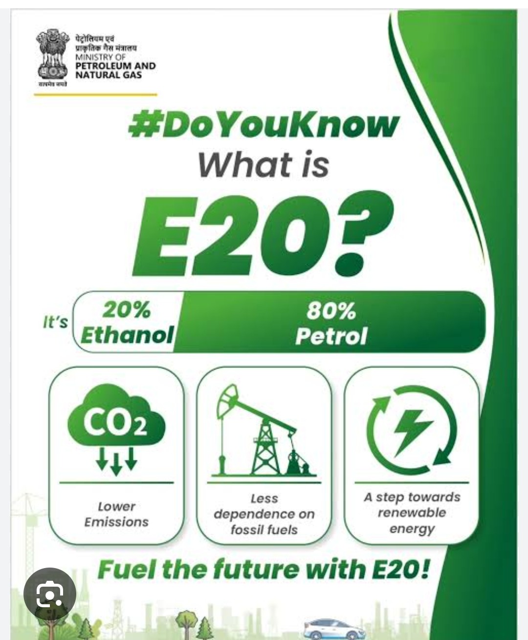 “E20” refers to petrol blended with up to 20 % ethanol and 80 % traditional petrol. Ethanol is an alcohol-based biofuel made primarily from crops like sugarcane, maize, and other agricultural produce.